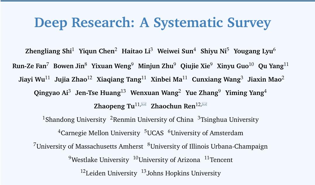 深度研究(Deep Research)概述 - 深度研究是让人工智能系统从“生成文本”进化为“发现知识”并完成复杂开放式任务的前沿领域 [1] - 该领域赋予大语言模型端到端研究工作流程,使其能作为智能代理在最少人工干预下生成有明确来源依据的研究报告 [4] - 目前深度研究已被广泛应用于文本生成、科研、软件工程、地球观测等领域 [1] 深度研究的能力演进三阶段 - **第一阶段:自主搜索** 专注自主寻找正确信息来源,生成简明且引用明确的答案,强调检索的准确性和效率 [4] - **第二阶段:整合研究** 将多源证据综合为连贯、结构化的报告,同时处理冲突和不确定性,以支持长周期任务和决策 [5] - **第三阶段:全栈AI科学家** 不仅能整合证据,还能生成假设、进行实验验证、批判现有观点并提出新视角,追求科学发现的新颖性、洞察力和结论可复现性 [5] - 整体体现了从简单信息检索到复杂分析,再到前沿科学研究的能力演进路径 [5] 深度研究系统的关键组成部分 - 系统是一个接收复杂问题并通过分析、检索、整理信息最终输出结构化答案的闭环工作流 [6] - **查询规划** 将复杂问题转化为一系列结构化、可执行的子任务,包括并行规划、顺序规划和树状规划三种策略 [8] - **知识检索** 已从传统文本搜索发展为利用实时网络搜索引擎获取最新信息,并涉及多模态检索 [9] - **记忆管理** 负责管理复杂长周期任务中上下文的动态生命周期,包括整合、索引、更新和遗忘四个环节 [10] - **答案生成** 需要应对调和矛盾证据、保持长周期一致性、展示透明推理过程和恰当引用等挑战,过程包括整合信息源、综合证据、构建推理框架及跨模态生成 [12] 深度研究面临的未来挑战 - **检索时机** 当前系统缺乏对检索时机的细粒度判断,易导致过度检索或检索不足,并在无相关证据时可能强行作答 [14] - **记忆进化** 当前主流的扁平化记忆架构无法捕捉知识元素间深层次的逻辑关系,限制了系统的复杂推理能力 [15] - **训练算法** 在多轮交互设置中,PPO和GRPO等强化学习算法会出现不稳定性,表现为奖励下降、生成无效响应及熵崩塌等现象 [16] - **评估体系** 主流的大模型作为评估者方法存在偏差和效率问题,可能偏好更长或更相似的回答,且大规模评估成本高昂 [17] 深度研究的未来发展方向 - 需要发展更强的统一推理范式来适配多种大语言模型,并具备无缝适应不同底层模型、任务风格与用户偏好的能力 [17] - 需要一种标准化、泛化能力强的记忆系统,以确保能正确存储、追踪和引用研究过程中发现的证据 [17] - 需要通用、模块化、可扩展的框架,使其能在不同环境与工具集之间自由切换 [17] - 总体目标是推动大语言模型从被动回答者向自主研究者转变,进行迭代式推理、证据综合及可验证的知识生成 [17] - 未来将加速推动深度研究系统向更通用、更可靠、更具可解释性的智能体形态演进 [17]