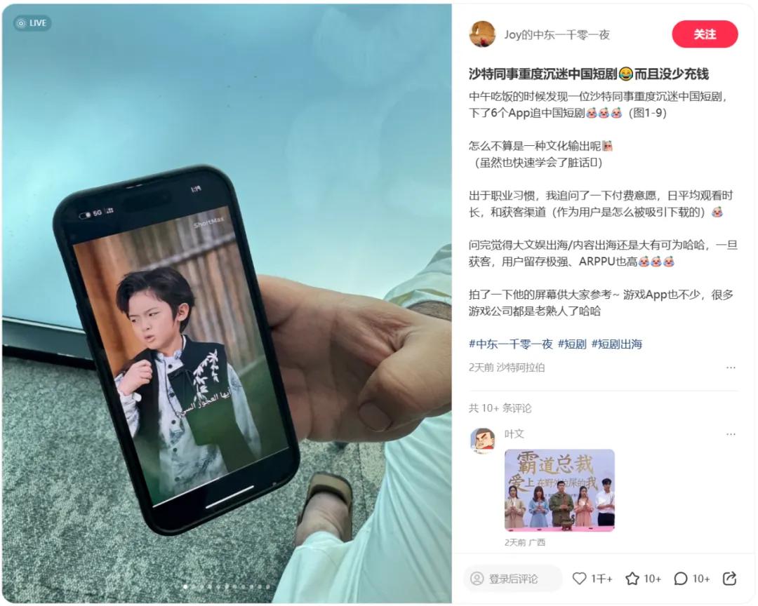 手机反光画面能看出,沙特老哥在开心憨笑哈哈 一页手机屏幕堪称海外短剧APP大全。包括ReelShort、NetShort、StardustTV、RapidTV、MoboReels、Micro Drama等多款产品。 一、老外爱追剧,一人下载多个短剧APP 随着微短剧从国内火到海外,世界各地开始掀起一股"竖屏"浪潮。除了美国、欧洲、东南亚等热门市场之外,连富得流油的中东土豪们也疯狂上头,狂磕 中国短剧。 就在前两天,DataEye短剧出海才发现一条"沙特老哥沉迷中国短剧"的帖子在小红书爆火,点赞量超3000个,评论量超700条。 帖子的内容也很简单:一位沙特老哥满脸笑容向博主展示他观看的短剧和短剧APP。 除此之外,甚至还有Last War、Titan War、Dark War等多款国产出海游戏,这位同事堪称中国内容产业的狂热爱好者了。 另外据笔者辨认,该沙特老哥所展示的两部短剧也均为国内短剧译制剧,对应的国内剧名分别为《少年自有少年狂》和《家有猛妹,满级女王》,前者是 一部"围棋"题材的萌宝逆袭类短剧,后者是女战神归来题材。 博主提到,出于职业习惯追问了该同事付费意愿、日均观看时长和获客渠道等,结果发现一旦获 ...