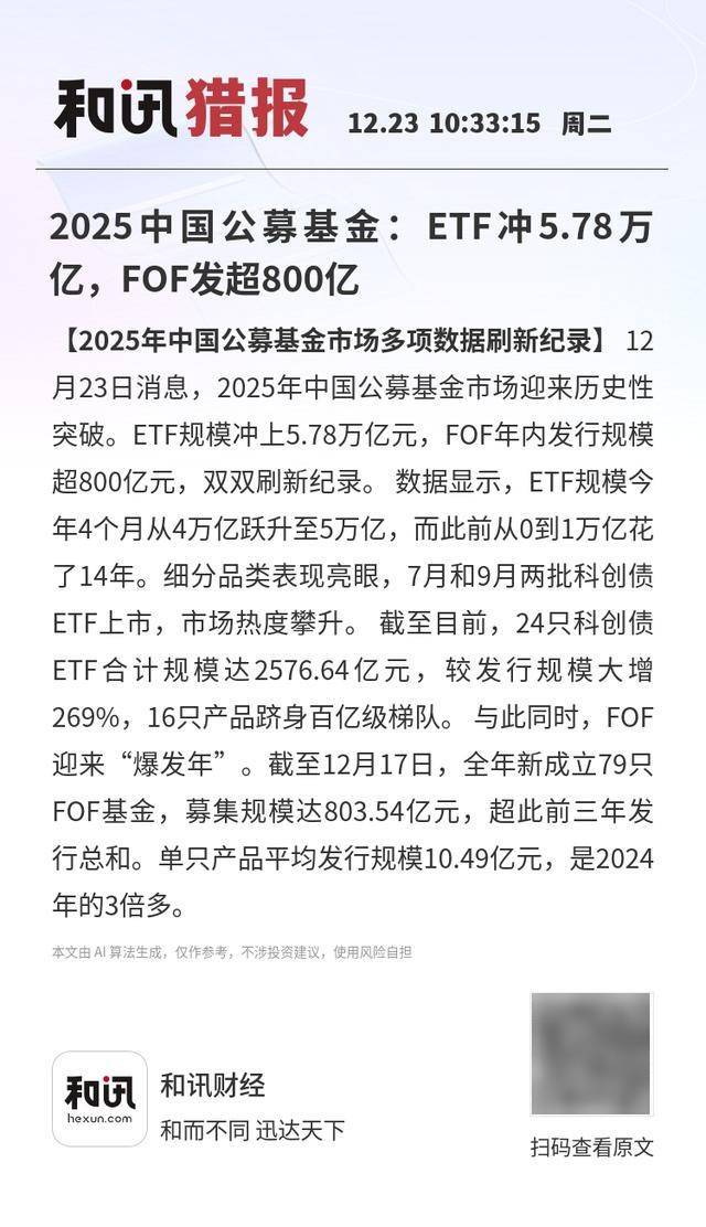 中国公募基金市场2025年发展概况 - 2025年中国公募基金市场迎来历史性突破,ETF总规模冲上5.78万亿元,FOF年内发行规模超800亿元,双双刷新纪录 [1] ETF市场发展 - ETF总规模在2025年短短4个月内从4万亿元跃升至5万亿元,而该品类从0到1万亿元的发展则用了14年 [1] - 细分品类科创债ETF市场热度持续攀升,2025年7月和9月两批产品先后上市 [1] - 截至目前,24只科创债ETF合计规模已达2576.64亿元,相较其697.73亿元的发行规模大幅增长269% [1] - 在上述科创债ETF中,有16只产品规模已跻身百亿级梯队 [1] FOF市场发展 - 2025年是FOF的“爆发年”,截至12月17日,全年新成立79只FOF基金 [1] - 全年新成立FOF基金合计募集规模达803.54亿元,超过此前三年发行规模的总和 [1] - 2025年单只FOF产品的平均发行规模达10.49亿元,是2024年平均发行规模的3倍以上 [1]