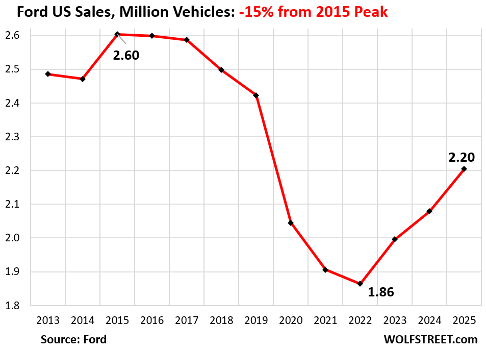 New-vehicle sales in 2025 rise barely above 1986: Four decades of structural stagnation, plunges, and partial recoveries. Total new-vehicle sales, as measured by deliveries to end users, rose by 2.4% in 2025 to 16.2 million vehicles, the highest since 2019, and just a hair above where sales had been in 1986 – four decades of structural stagnation, plunges, and partial recoveries. The two best years were 2000 and 2016, with 17.4 million and 17.5 million vehicles sold. In 2025, sales were 6.4% below the year ...