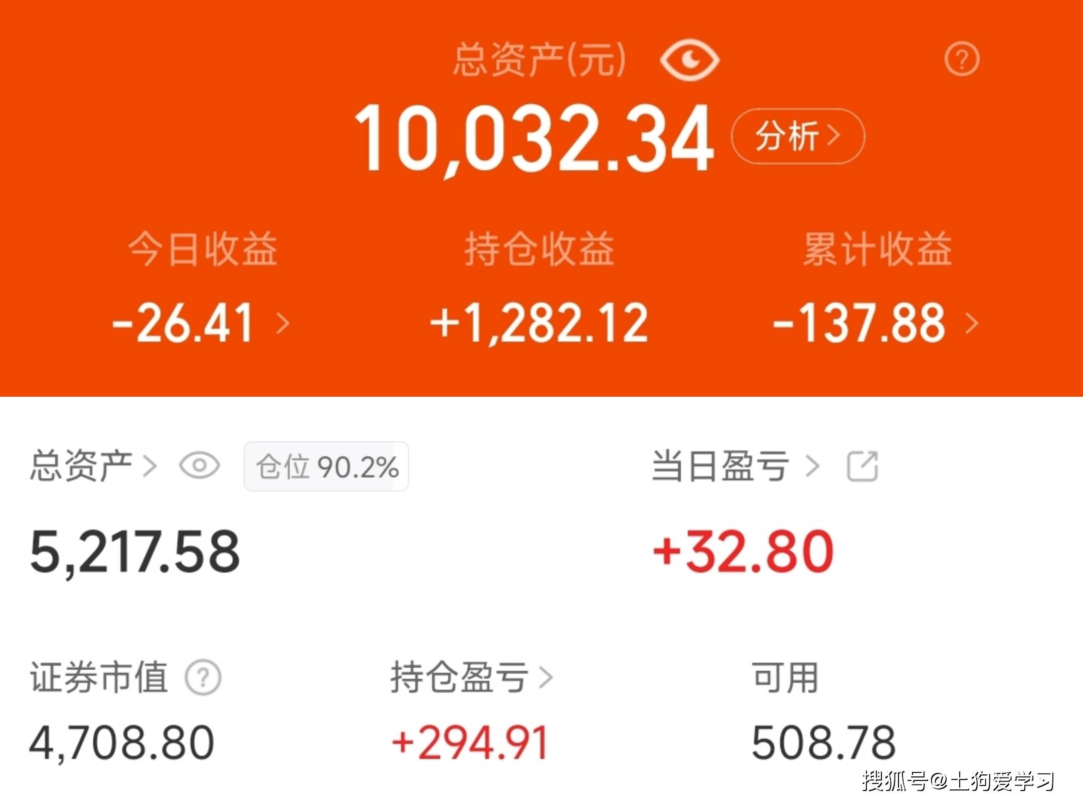 26.01.09 基金盈收6元~ 场外买入200元。 场内盈32元;场外亏26元。 4,1U0.0U 总资产(元) 4 (2) 10,032.34 GMD 今日收益 持仓收益 累计收益 -26.41 > 搜狐号@土狗爱学习 总资产 > ◎ 仓位 90.2% 当日盈亏 > CG 5,217.58 +32.80 证券市值 2 可用 持仓盈亏 > 4,708.80 +294.91 508.78 搜狐号@土狗爱学习 ...