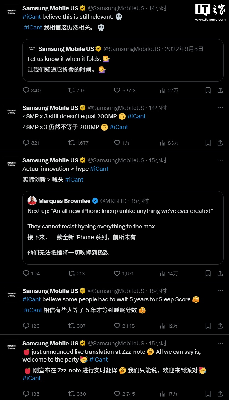 三星社媒“围攻”苹果:从相机到折叠屏、创新