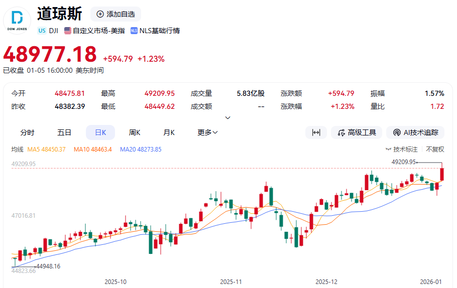 美股市场整体表现 - 当地时间1月5日,美股三大指数集体收涨,道琼斯工业平均指数上涨1.23%,盘中首次突破49000点,再创历史新高;纳斯达克综合指数上涨0.69%,标准普尔500指数上涨0.64% [1][3] - 标普500指数在过去三年间累计上涨78%,其中2023年、2024年和2025年分别上涨了24%、23%和16% [6] - 根据策略师平均预计,标普500指数2026年将上涨9.2%,但这一预期涨幅将落后于此前三年 [6] - 历史数据显示,在中期选举年份,股市的平均涨幅仅为3.8%,上涨概率为55% [6] 大型科技股与人工智能 - 大型科技股多数上涨,阿斯麦上涨超过5%,安森美半导体、特斯拉上涨超过3%,亚马逊上涨近3%,Meta上涨超过1%,奈飞、谷歌小幅上涨 [7] - 苹果、博通下跌超过1%,微软、英伟达、英特尔小幅下跌 [7] - 亚马逊正式推出Alexa+专属网站Alexa.com,用户可通过浏览器与AI助手对话,此举意味着亚马逊与OpenAI旗下ChatGPT展开更直接竞争 [7] - 英伟达宣布其CES 2026期间的直播活动将不包含新GPU产品,而是专注于游戏、创作者应用及合作伙伴生态,同时为“思考”工具推出Alpamayo模型 [8] 能源板块 - 美股能源板块普遍上涨,油田服务公司斯伦贝谢股价上涨近9%,哈里伯顿上涨近8%,市场普遍认为这两家公司有望参与委内瑞拉能源基础设施重建 [8] - 雪佛龙上涨超过5%,该公司已在委内瑞拉开展业务,是目前唯一在委内瑞拉运营的美国大型石油公司,截至2025年第四季度末,其日均出口量约为14万桶 [8] - 美国能源、康菲石油、埃克森美孚上涨超过2%,英国石油小幅上涨 [8] 生物医药与热门个股 - 诺和诺德上涨超过5%,公司宣布在美国开始推出首款用于减重的GLP-1口服药,该药物的现金自付价格为每月149美元至299美元之间,为市场上最低 [8] 热门中概股 - 纳斯达克中国金龙指数上涨0.49%,叮咚买菜上涨超过7%,贝壳上涨超过6%,哔哩哔哩、腾讯音乐、爱奇艺上涨超过3% [9] - 满帮、霸王茶姬等上涨超过2%,金山云、富途控股等上涨超过1%,唯品会、携程等小幅上涨 [9] - 蔚来下跌超过5%,小米集团(ADR)下跌超过2%,网易、小鹏汽车、新东方下跌超过1% [9]