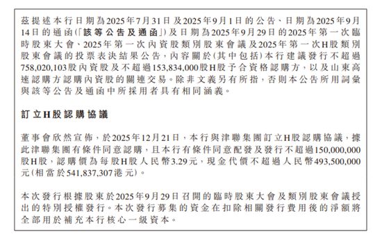 核心交易概述 - 威海银行与津联集团订立H股认购协议,拟向后者发行不超过1.5亿股H股,募集资金净额将全部用于补充核心一级资本 [1] - 此次H股发行认购价为每股人民币3.29元,较公告日香港联交所收市价每股3.06港元溢价约17.97%,现金代价不超过人民币4.935亿元 [2] - 此次津联集团认购H股,是继2025年7月底董事会通过向特定对象发行内资股及H股议案后,H股部分的具体落实 [2][3] 发行方案细节 - 公司于2025年7月底通过议案,计划向特定对象发行不超过7.6亿股内资股及不超过1.5亿股H股 [2] - 内资股发行部分:发行不超过7.6亿股,约占发行前已发行内资股总数的15.3%,发行价格定为每股3.29元,预计募集资金不超过24.9亿元,发行对象主要为现有内资国有股东,包括控股股东山东高速集团及其控股子公司山东高速 [2] - H股发行部分:发行不超过1.5亿股,约占发行前已发行H股总数的15.3%,发行价格为每股3.29元人民币等值港元,预计募资不超过5.1亿元,发行对象为具备认购资格的投资者 [3] - 内资股认购协议已于2025年9月1日与山东高速集团及山东高速订立,而此次与津联集团的H股认购协议则于2025年12月21日订立 [3][4] 发行背景与紧迫性 - 截至2025年第三季度末,威海银行的核心一级资本充足率为8.02%,已非常接近《商业银行资本管理办法》规定的7.5%监管最低要求 [2] - 对比2024年末,威海银行核心一级资本充足率曾达9.31%,资本消耗较快,补充资本迫在眉睫 [2] - 公司H股长期面临流动性困局,自2020年上市后交易寥寥无几,股价较上市时大幅破发,2025年几乎没有流动性 [2] 交易相关方信息 - H股认购方津联集团隶属天津国资委旗下,是负责跨境资本运作、资源整合、资金融通等功能的金融机构,于2024年初跻身威海银行前十大股东之列 [4] - 内资股认购方为山东高速集团及其控股子公司山东高速,为公司控股股东,将按现有持股比例参与认购 [2]