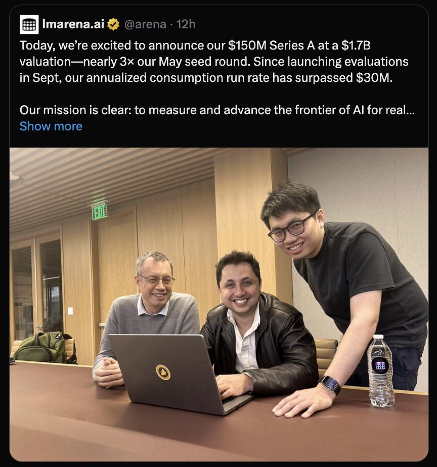 闻乐 发自 凹非寺 量子位 | 公众号 QbitAI 大模型竞技场 LMArena 官宣拿下 1.5亿美元 A轮融资。 估值升至17亿美元,妥妥的新年开门红! 这波融资由Felicis和加州大学投资公司UC Investments领投,Andreessen Horowitz、The House Fund等机构跟投。 资本用真金白银投票,足以见得AI时代大模型评估这个赛道有多香~ 而这支90后华人含量99%团队的走红之路,还得从2023年ChatGPT横空出世后说起。 从学术探索到商业崛起 LMArena的前身是曾经火爆AI圈的 Chatbot Arena ,最早由 LMSYS 这个自发的开源组织创建。 组织的核心成员全是来自UC伯克利、斯坦福、UCSD、CMU等顶尖高校的学霸。 他们的开源推理引擎 SGLang 在业内首次实现了在96块H100上跑出几乎媲美DeepSeek官方报告吞吐量的开源方案。 目前SGLang已经实现大规模部署,被xAI、英伟达、AMD、谷歌云、甲骨文云、阿里云、美团、腾讯云等企业和机构采用。 不过,比起硬核技术,他们最主要也更出圈的工作是 对大模型进行评估 。 在ChatGPT、Cl ...
