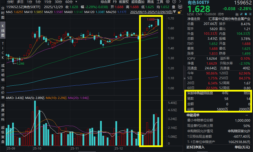 市场表现与资金流向 - 2025年12月29日,A股市场分化,沪指录得九连阳,但有色金属板块出现回调,高“含铜量”的有色50ETF(159652)收跌2.28%,报1.628元,全天成交额达3.43亿元 [1] - 尽管ETF价格下跌,但资金呈现逆势净流入,有色50ETF(159652)全天获得超6200万元资金净申购 [1] - 该ETF标的指数成分股多数回调,其中赣锋锂业跌4.74%,天齐锂业跌4.54%,洛阳钼业跌4.41%,紫金矿业跌2.62%,中国铝业跌3.29% [1][2] 商品价格分化 - 当日不同金属品种价格表现剧烈分化,工业金属中的LME铜价涨超3%,早盘一度涨超5% [3] - 贵金属价格走低,现货黄金跌超1%,一度跌破4450美元/盎司,现货白银跌超5%,一度跌破75美元/盎司 [3] - 能源金属巨震,碳酸锂期货触及跌停,收跌7.89% [3] 核心投资逻辑:多重因素共振 - **货币侧宽松**:美联储已进入降息周期,自2024年9月至2025年12月累计降息175个基点,市场预期美国实际利率和美元指数或持续走弱,对黄金等金属价格形成支撑 [5] - **供给侧刚性**:以铜为代表的工业金属供给端呈现刚性且脆弱,铜矿供应扰动频发,核心矿山下调产量指引,叠加过去十年资本开支不足,据中邮证券测算,未来5年全球铜供需缺口将逐渐扩大,从2025年的43.7万吨扩大至2030年的161.63万吨 [6][7] - **需求新动能**:新能源、电动汽车、AI及电网建设等新兴产业成为有色金属需求的新增长点,高盛预测到2030年,全球电网及电力基础设施建设将贡献60%的铜需求增长,增量相当于当前全球铜消费总量与美国年消费量之和 [8] 产品结构与优势 - 有色50ETF(159652)全面布局各大金属板块,覆盖金、铜、铝、锂、稀土等子板块 [8] - 该ETF标的指数的“金铜含量”合计达45%,其中铜含量31%,金含量14%,在同类产品中领先 [10] - 指数龙头集中度高,前五大成分股集中度达36%,前十大成分股集中度达52.7% [11] - 指数估值相对合理,截至2025年11月28日,市盈率为23.11倍,相比5年前下降了66%,而同期指数累计涨幅达86.28%,表明涨幅主要由盈利驱动 [12]