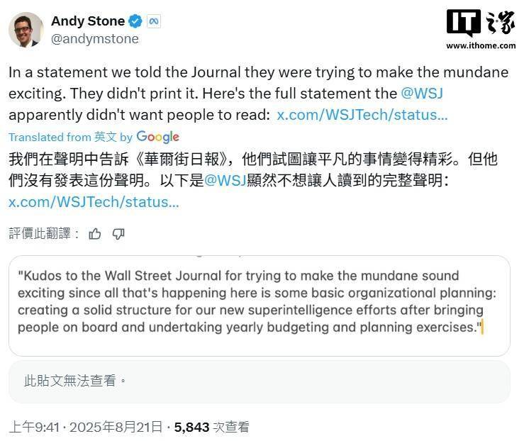 IT之家 8 月 21 日消息,Meta 发言人 Andy Stone 今天在 X 平台回应了《华尔街日报》关于公司 AI 部门停止招聘的一些传闻。 回应中他以略带调侃的语气表示,《华尔街日报》很努力地把枯燥的事情讲得很刺激,但 Meta 其实只是在进行基础操作:吸纳新人后为新的 AI 项目建立 一个稳固架构,并进行年度预算和规划。 Andy 随后表示,公司只是在进行一些基本的组织规划调整,在新的 AI 项目建立架构期间,将暂停部分招聘,此前公司已经引入了多名新成员加入团队。 截至IT之家发稿,《华尔街日报》关于 Meta AI 部门停止招聘的相关帖文已经删除。 内部备忘录显示,Meta 近日对其 AI 组织架构进行了重大调整,新的组织将被命名为"Meta 超级智能实验室",这个实验室将拥有四个团队,其中核心是 TBD 实验室,专注于基础模型的研究,例如 Llama 系列,剩余三个团队则分别专注于研究、产品整合以及基础设施建设。 回顾历史,Meta 的"挖角大战"发起于 6 月末,期间积极接触并挖角各路 AI 人才,此前曾有传言称 Meta 开出了高达 2000 万美元(IT之家注:现汇率约合 1.44 亿元 ...