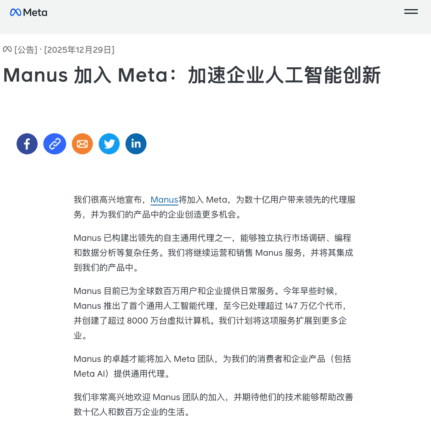 张鹏科技商业观察 . 以下文章来源于张鹏科技商业观察 ,作者张鹏 聊科技,谈商业。 今天凌晨收到 Manus 联合创始人的微信:「鹏哥,我们今天有个新进展,之前确实不好透露太多。现在正式发布了,我第一时间给你说一声。」 之前 Manus 20 亿美元估值的新一轮融资正在进行,已经是业界印证的消息,但不久前听到了 Meta 这个涉及接近 40-50 亿美元(小道消息未确认)的 Deal 的可能性,一度觉得有点假,更没想到会这么快,真是闪电般的速度。 一年多前创始人肖弘和团队拒绝了某巨头数千万美元并购的 Deal,他和我说,「我们犹豫过,但最终想明白了,一生没有多少值得 All in 的机会,我们 不想放弃这个机遇。」现在,All in 获得了回报,依靠 Manus 这个产品,他们在不到一年时间收获了超百倍价值增长,年内就打了个「本垒打」! 要赞叹他们之前敢于继续向前探索的决定,要恭喜他们获得了了不起的回报。 也更要感谢他们,2025 年结束之前,印证了 AI 应用创新的价值和机会,这会给所有创业者和资本信心的巨大加持。 之前我写过一篇对于 Manus 的深度分析,后续的发展和今天的 Deal 基本印证了这些分析 ...