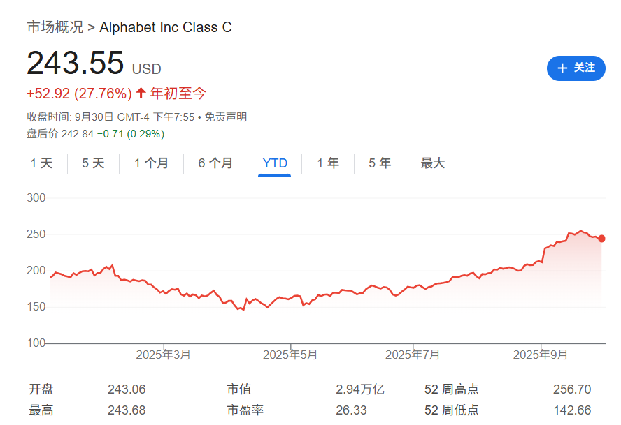 Alphabet股价在第三季度上涨38%,创下自2005年以来的最佳单季表现,其年初至今涨幅超过28%,在"七巨头"中的表现仅次于英伟达。 股价飙升的主要催化剂是其AI产品Gemini的强劲增长,以及谷歌反垄断案裁决结果好于预期。 Alphabet的A类股在第三季度飙升38%,这是自2005年以来的最大季度涨幅。这一表现使其年初至今的涨幅超过28%,在备受关注的"科技 七巨头"中位居第二,仅次于芯片制造商英伟达。 推动此次股价大涨的关键催化剂,是其人工智能产品Gemini的亮眼增长,以及一桩反垄断案件取得了优于预期的解决方案。 本月早些时 候,Gemini一度登顶苹果公司的美国应用商店排行榜。 凭借在人工智能领域的强劲势头,Alphabet Inc.的股价在刚刚结束的季度中创下了二十年来的最佳表现。 9月2日,美国联邦法官Amit P. Mehta在谷歌的反垄断案中裁定其不必出售Chrome浏览器,更重要的是允许谷歌继续在搜索引擎服务上与苹 果合作。确保了谷歌在苹果设备上的默认搜索引擎的地位。 而谷歌这一强劲反弹标志着投资者信心的显著回归。今年四月,该股一度年内下跌达24%。 AI反击战:从"输家"到"赢家" ...