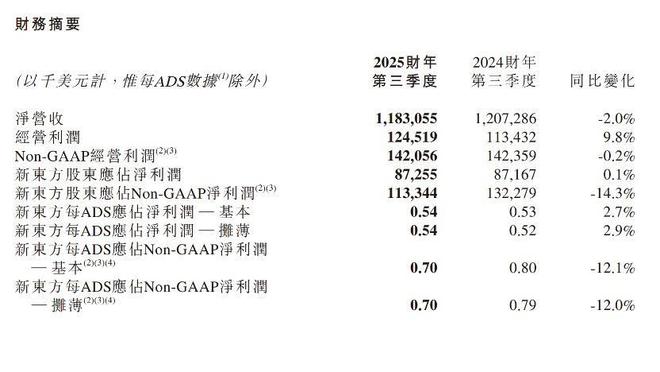 财务业绩概览 - 2025财年第三季度总营收11.83亿美元,同比下降2% [1] - 净利润8725.5万美元,同比微增0.1% [1] - 稀释后每ADS收益为0.70美元,低于上年同期的0.79美元 [1] - 若剔除东方甄选业务,公司营收为10.38亿美元,同比上升21.2% [1] - 经营利润为1.245亿美元,同比增长9.8% [2] 核心教育业务表现 - 出国考试准备业务营收同比增长约7.1% [2] - 出国咨询业务营收同比增长约21.4% [2] - 针对成人及大学生的国内考试准备业务营收同比增长约17.0% [2] 教育新业务增长势头 - 教育新业务营收同比增长34.5% [3] - 非学科类辅导业务在近60个城市开展,本财季报名人次约40.8万 [3] - 十个超级大城市为教育新业务贡献了超过60%的收入 [3] - 智能学习系统及设备在约60个城市中采用,季度活跃付费用户约为30.9万 [3] 文旅业务发展 - 文旅业务收入本季度增长85% [3] - 公司为55个城市的K-12和大学年龄学生提供游学和研学服务,收入贡献超过50% [3] - 针对中年和老年受众的旅游产品也已开始提供 [3] 技术投入与AI应用 - 本季度投资2970万美元用于改进和维护OMO教学系统 [3] - 公司利用开源大语言模型及自研AI技术开发教育解决方案,如论文评分、口语评估等工具 [3] - 推出AI内容创建平台和学生表现反馈应用程序,以支持课程计划并加强家校沟通 [3] - 建立支持AI的综合常见问题知识库 [3] 管理层战略与展望 - 公司贯彻以长期可持续发展为核心的策略,通过提升产品品质和营运效率推动增长 [4] - 持续监控教学空间布局以确保配合业务增长及营运效率 [5] - 推进OMO教学系统并加大AI技术在教育领域的投入 [5] - 开发创新技术以支持教师及员工,提升营运效率及服务满意度 [5] 业务前景与风险提示 - 受宏观经济形势和国际关系变化影响,预计出国咨询业务第四季度增速将放缓 [3] - 海外相关业务面临持续压力,但公司相信该业务将最终稳定下来 [3]
