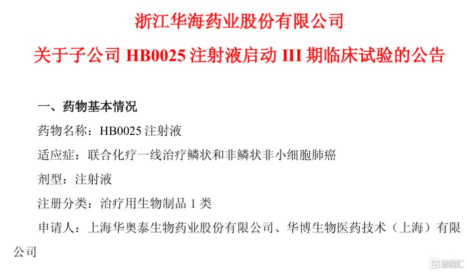 华海药业:子公司 HB0025 注射液启动III期临床试验