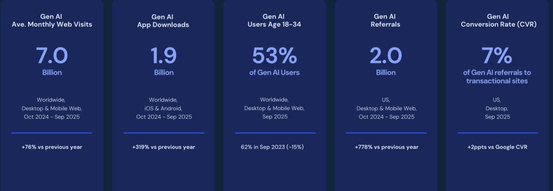 如果说2023年是生成式AI的「出道年」,2024年是「炒作年」,那2025年,就是生成式AI真正走进普通人生活的「落地年」。 数字数据公司Similarweb重磅发布年度AI报告! 最新数据显示: 技术不再只在「早期玩家」手里打转,而是悄悄变成了每个人的日常工具。 这份《2025生成式AI全景报告》基于海量真实访问数据,拆解了GenAI从技术突破,走向「数字基础设施」的关键一年。 报告抛出了三个特别值得关注的信号: 诸神之战,铁王座与挑战者 生成式AI(Generative AI,GenAI)已经完成了华丽转身:从昔日的技术突破,变成了新的数字基础设施。 短短一年间,它不再是人们茶余饭后的猎奇对象,而是演变成了日常行为,彻底重塑了人们在线搜索、学习和创造的方式。 ChatGPT网站:3年冲进全球流量前五 数据说明了一切: 链接:https://www.similarweb.com/corp/2025-generative-ai-landscape 全球GenAI平台月访问量已经超过70亿次,同比暴涨76%; 移动端App下载量达到19亿次,一年之内直接翻了3倍多; 过去最「爱玩AI」的18–34岁用户占比, ...