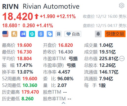 | RIVN Rivian Automotive | | | --- | --- | | 18.420↑+1.990 +12.11% 收盘价 12/12 16:00 美东 18.680 + 0.260 +1.41% | 盘前价 12/15 04:17 美东 | | 一 2 24 4 3 8 8 目 ♥ 25 | ● 快捷交易 | | 最高价 19.600 开盘价 16.820 | 成交量 1.04亿 | | 最低价 16.730 昨收价 16.430 | 成交额 19.51亿 | | 平均价 18.804 市盈率TM 亏损 | 总市值 225.81亿 (…) | | 振 幅 17.47% 市盈率(静) 亏损 | 总股本 12.26亿 | | 换手率 13.07% 市净率 4.457 | 流通值 146.17亿 | | 52周最高 19.600 委 比 96.08% | 流通股 7.94亿 | | 52周最低 10.360 量 比 2.07 | 色 手 1股 | | 历史最高 179.470 股息TTM -- | | | 历史最低 8.260 股息率ITM -- | | 上周五(12日)大幅收涨12.11%的R ...
