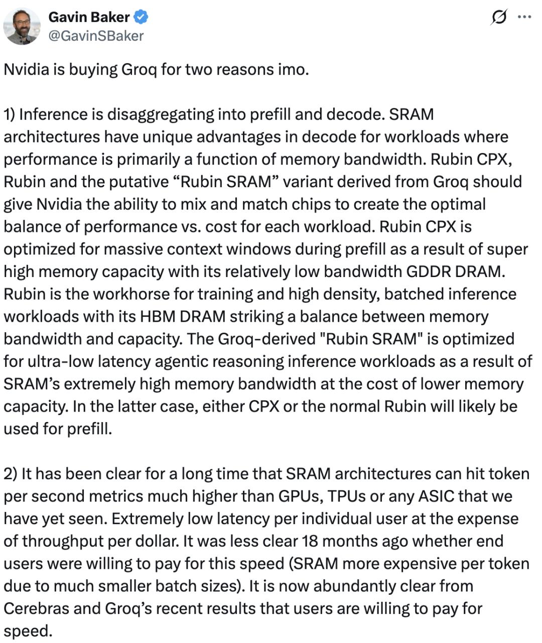 文章核心观点 - 英伟达计划投资200亿美元以收购或深度合作的方式拉拢芯片公司Groq 此举被视为应对谷歌TPU等新芯片范式威胁 并弥补自身在AI推理市场短板的关键战略布局 [1][2][3][18] 英伟达的战略动机与行业背景 - 谷歌通过自研TPU成功降低了对英伟达GPU的依赖 削减了AI训练和推理成本 证明了GPU并非唯一解决方案 给英伟达带来了竞争压力 [17] - 随着基础模型进展放缓 AI竞争重点从训练转向应用层 应用市场对推理速度的要求变得至关重要 [17] - 此次对Groq的布局 标志着英伟达在巩固训练市场霸主地位的同时 正式大举进入推理芯片这一新兴且竞争激烈的市场 [18][19] Groq LPU的技术优势与市场定位 - Groq的LPU在AI推理的decode(解码)阶段速度极快 远超GPU、TPU及大多数ASIC 其采用片上SRAM 速度比使用HBM的GPU快100倍 处理单个用户时能保持每秒300–500个token的速度 [6][13] - LPU的片上SRAM容量较小 单颗芯片仅230MB 而英伟达H200 GPU的HBM3e显存高达141GB 因此运行大模型需要连接成百上千颗LPU芯片 硬件规模和投资可能非常巨大 [14][15][16] - 市场验证表明 用户愿意为“速度”付费 Groq的业绩证明低延迟推理是一个真实存在且高速成长的需求 [16] GPU在AI推理中的架构性挑战 - GPU架构在推理过程的decode阶段存在短板 decode是串行任务 需要逐个生成token 对延迟极其敏感 但GPU数据主要存放在片外HBM 每次生成token都需从内存读取数据 导致算力闲置 FLOPs利用率低 [12] - 相比之下 推理的prefill(预填充)阶段是并行计算 GPU擅长处理 对延迟不敏感 [12] - 有观点指出 GPU架构难以满足推理市场对低延迟的需求 HBM显存速度是瓶颈 [7] 交易对英伟达的意义与潜在影响 - 此次交易被视为英伟达为自身注射的一剂“疫苗” 旨在通过引入Groq的人才与技术 补齐在低延迟推理场景的短板 抵御竞争对手 避免在AI时代被新玩家颠覆 [16] - 推理芯片市场可能与训练芯片市场特性不同 被描述为一项高销量、低利润的苦活 与英伟达当前毛利率高达70-80%的GPU业务模式截然不同 [19]