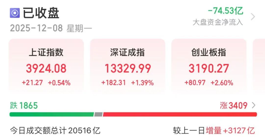 市场整体表现 - 福建板块成交额达到1739.2亿元,板块内超20只个股掀起“涨停潮”[3] - 科技主线活跃,共封装光学(CPO)板块全天领涨[3] - 商业航天板块冲高回落,煤炭、有色金属、化工、中药等板块回调[5] 科技主线与算力产业链 - CPO概念三大龙头“易中天”成交额均超160亿元,位列全市场成交额前三[3] - 天孚通信盘中“20CM”涨停,收盘涨19.19%,最新市值为1841.7亿元[3] - 算力产业链持续走强,CPO、F5G、光纤、铜缆高速连接、存储芯片等板块涨幅居前[6] - 东田微、致尚科技“20CM”涨停,天孚通信、长光华芯等个股涨幅居前[6] - 寒武纪-U午后一度大涨超6%,收盘涨4.63%,成交额138.38亿元[3][4] - 香农芯创收盘涨15.25%,成交额108.70亿元[4] 个股成交与涨幅详情 - 中际旭创成交额231.30亿元,涨幅6.14%[4] - 新易盛成交额223.07亿元,涨幅7.15%[4] - 胜宏科技成交额151.74亿元,涨幅5.54%[4] - 工业富联成交额151.17亿元,涨幅3.75%[4] - 东方财富成交额137.77亿元,涨幅1.42%[4] - 航天发展成交额133.17亿元,涨幅6.95%[4] - 阳光电源成交额129.54亿元,涨幅1.25%[4] - 三花智控成交额117.71亿元,涨幅3.77%[4] - 环旭电子午后直线拉升“秒”涨停,收盘股价24.77元/股,最新市值545.17亿元[9] - 元件板块表现活跃,泰晶科技、景旺电子涨停[10] 福建本地股表现 - 福建自贸区板块表现活跃,安记食品五连板,龙洲股份四连板,舒华体育三连板[13] - 红相股份“20CM”两连板,涨幅19.98%[13][14] - 达华智能、实达集团、凤竹纺织等超20只个股涨停[13] - 涨幅居前的福建股包括锐捷网络(+11.23%)、光莆股份(+10.53%)、闽发铝业(+10.08%)等[14] 行业驱动因素 - 谷歌产业链持续走强,谷歌发布先进AI模型Gemini 3及新一代AI图像生成模型,其自研AI芯片TPU相关消息引发关注[11] - 谷歌云AI基础设施负责人表示未来算力将每6个月翻倍,预计谷歌明年算力需求将有较大幅度上修[11] - 亚马逊AWS推出新一代AI训练芯片Trainium 3,预告Trainium 4开发计划,称其比英伟达GPU更便宜高效[11] - DeepSeek发布两个正式版模型:DeepSeek-V3.2和DeepSeek-V3.2-Speciale,旨在平衡推理能力与输出长度及探索模型能力边界[12] - 市场对摩尔线程、沐曦股份、昂瑞微等芯片龙头公司上市展现出高参与热情[12] 政策与区域规划 - 厦门市发布“十五五”规划建议,提出深入推进数字厦门建设,强化算力、算法、数据供给,推进城市全域数字化转型[15] - 规划建议全面实施“人工智能+”行动,打造国家人工智能应用中试基地[15] - 规划提出加快建设全国海洋经济发展示范区,发展现代海洋产业体系,培育海洋药物、生物制品、高端装备和新材料等新兴产业[15]