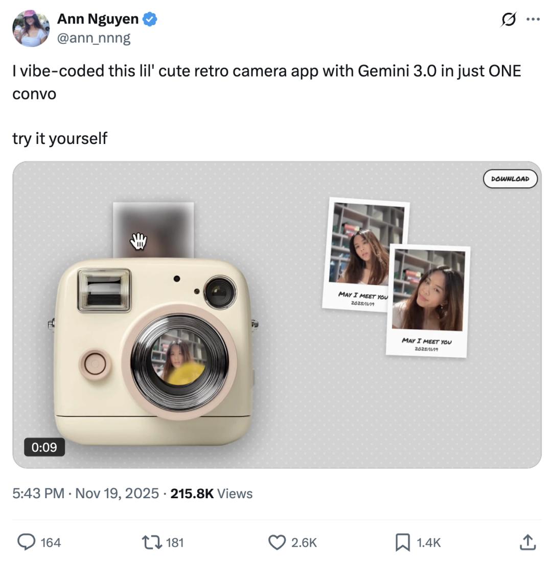 Gemini 3 Pro的功能展示 - 发布仅一天后即被用户开发出多种创新应用,例如通过单次对话即可生成带有复古滤镜的数字拍立得应用[1][9] - 能够生成完整的交互式应用,包括3D小星球上的吃豆人游戏、90年代主题公园游戏、乐高虚拟世界以及3D可视化项目[14][17][19][22] - 开发效率极高,可在不到30分钟内生成2D跑酷游戏,仅用3个提示词即可创建可交互的迷宫游戏[26][31] 多模态生成能力 - 支持从图像生成应用,即使是画在卫生纸上的草稿也能瞬间转化为可访问的网站[34] - 能够将单张房屋平面图转化为可交互的房屋布局设计应用,并能从单张图片生成包含流动瀑布和樱花等细节的3D体素世界[34][35] - 可根据简单提示词生成整个手机应用的UI界面,或根据一张图制作出布局完全一致的网页版[38][40] 工具与内容创作应用 - 能够生成实用工具,例如具备实时语音提示功能的录屏工具,录制的视频可直接下载为MP4格式[42] - 在内容创作方面支持调整视频比例并提供AI生成的视频创意,有助于提升面试或工作汇报等场景的流畅度[44][45] - 用户可快速生成各种免费小工具,无需担心付费、水印或VIP限制问题[41]