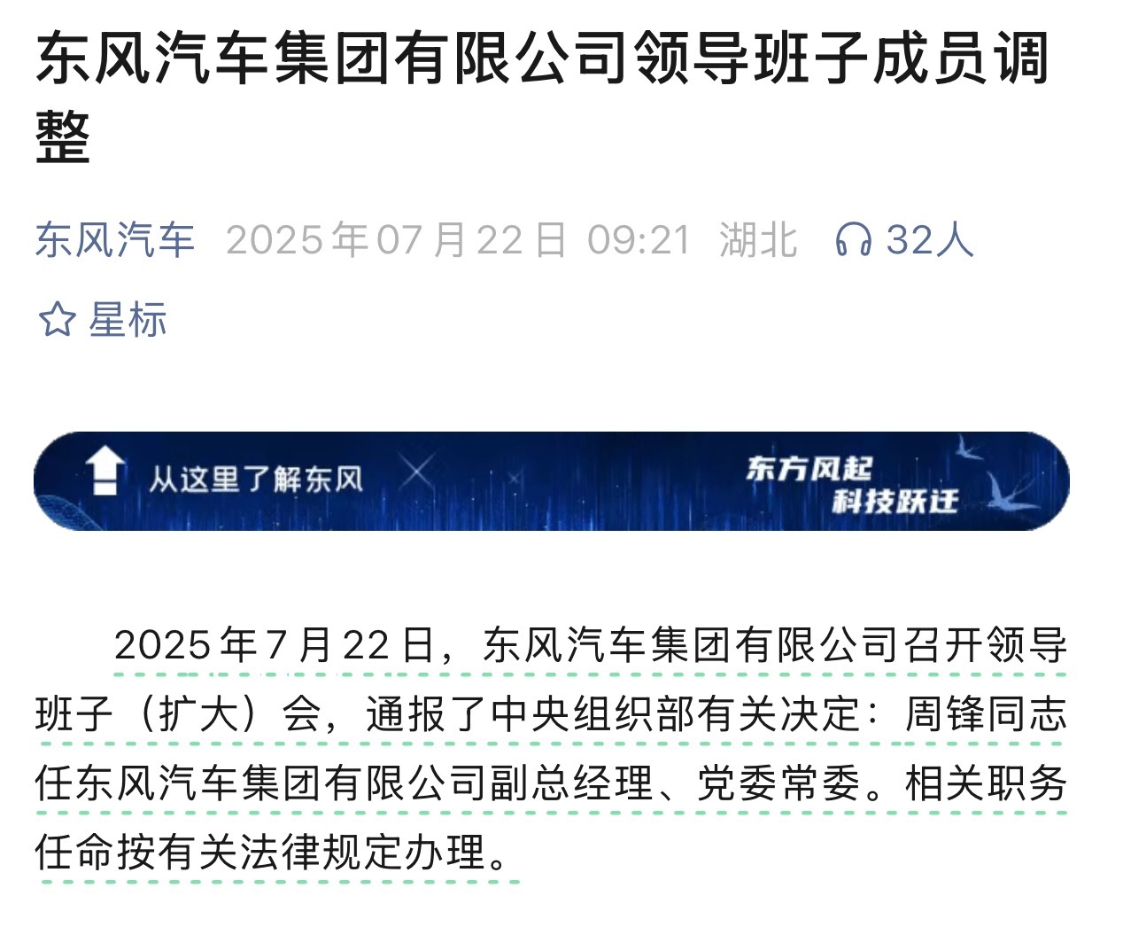 东风变革、人事先行,周锋上任东风副总经理、余飞离任东风奕派