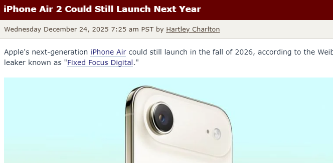 来源:环球网 【环球网科技综合报道】12月25日,据macrumors报道,苹果第二代iPhone Air或仍能按原定计划,于 2026年秋季正式推出。 据悉,消息人士确认第二代iPhone Air将瞄准秋季发布窗口,而苹果另一款机型iPhone 17e已进入大规模 生产,预计会在2026年春季发布会率先亮相。不过,这一说法与此前多项权威报道存在冲突,此前多方 消息均指出,受初代iPhone Air销量不及预期影响,苹果已决定将第二代机型推迟至2027年3月,与 iPhone 18系列标准版、iPhone 18e低端机型同步发布。 外媒指出,针对初代机型的用户槽点,第二代iPhone Air传出多项升级计划。爆料显示,新机将新增一 颗后置摄像头,解决初代单摄影像能力不足的问题,同时有望下调售价,提升产品竞争力。此外,轻量 化机身设计、蒸汽室散热系统以及更大容量电池,也将成为第二代机型的核心升级点,进一步优化用户 体验。 行业分析认为,2026年秋季本就是iPhone Air 2的原定发布时间,若苹果能加快新功能研发进度,调整 产品策略,秋季推出仍有可行性。(旺旺) ...