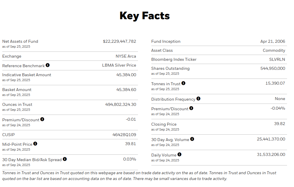 | Net Assets of Fund | $22,229,447,782 | Fund Inception | Apr 21, 2006 | | --- | --- | --- | --- | | as of Sep 25, 2025 | | | | | | | Asset Class | Commodity | | Exchange | NYSE Arca | Bloomberg Index Ticker | SLVRLN | | Reference Benchmark | LBMA Silver Price | | | | | | Shares Outstanding | 544,950,000 | | Indicative Basket Amount | 45,384.00 | as of Sep 25, 2025 | | | as of Sep 25, 2025 | | Tonnes in Trust | 15,390.07 | | Basket Amount | 45,384.60 | as of Sep 25, 2025 | | | as of Sep 25, 2025 | | | | | | ...