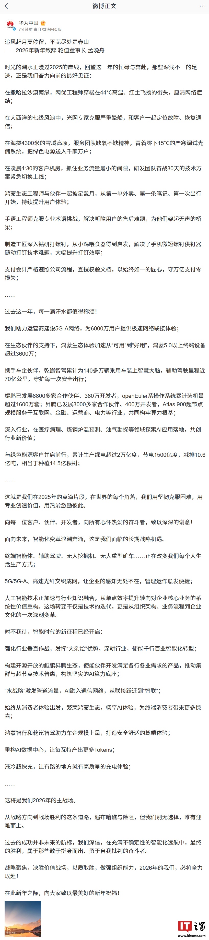 12月30日早间,华为官方公众号发布了轮值董事长孟晚舟的新年致辞。致辞以极具诗意的笔触,温情的回顾了华为在2025年忙碌与奔赴的奋斗历程。在娓 娓道来的叙事中,穿插着关于华为战略布局、技术突破与生态构建的诸多关键信息。 1、2025年,华为助力运营商建设5G-A网络,为6000万用户提供极速网络联接体验。 4、2025年,鲲鹏已发展6800多家合作伙伴、380万开发者。昇腾已发展3000多家合作伙伴、400万开发者。 5、2026年华为将发挥的"大杂烩"优势,助力千行百业智能化转型。 6、持续构建开源开放的鲲鹏昇腾生态,推动集群与超节点技术普惠。 轮值董事长 孟晚舟 时光的潮水正漫过2025的岸线,回望这一年的忙碌与奔赴,那些深浅不一的足迹,正是我们奋力向前的最好见证: 在撒哈拉沙漠南缘,网优工程师穿梭在44℃高温、红土飞扬的街头,厘清网络症结; 在大西洋的七级风浪中,光网专家克服严重晕船,和客户一起定位故障、恢复通信; 在海拔4300米的雪域高原,服务团队缺氧不缺精神,冒着零下15℃的严寒调试光储系统,把绿色电源送入千家万户; 在凌晨4:30的客户机房,抓住业务流量最小的间隙,研发团队奋战30天的技术方案紧 ...